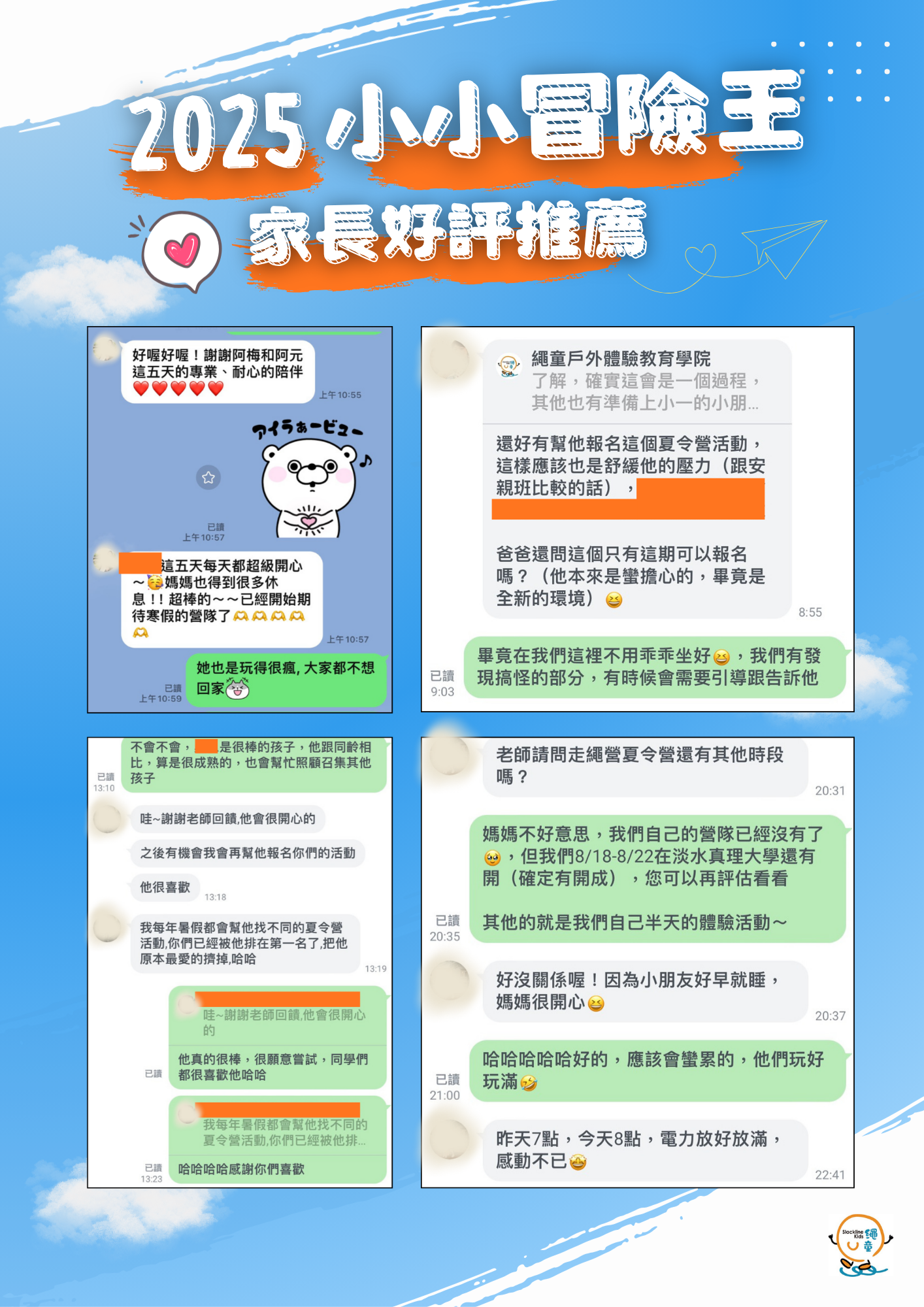 - 不論如何預判,天氣仍為不可準確預測之因素,因此如有天氣不佳之疑慮,繩童會依天氣調整課程順序,或改在室內從事類似之課程。