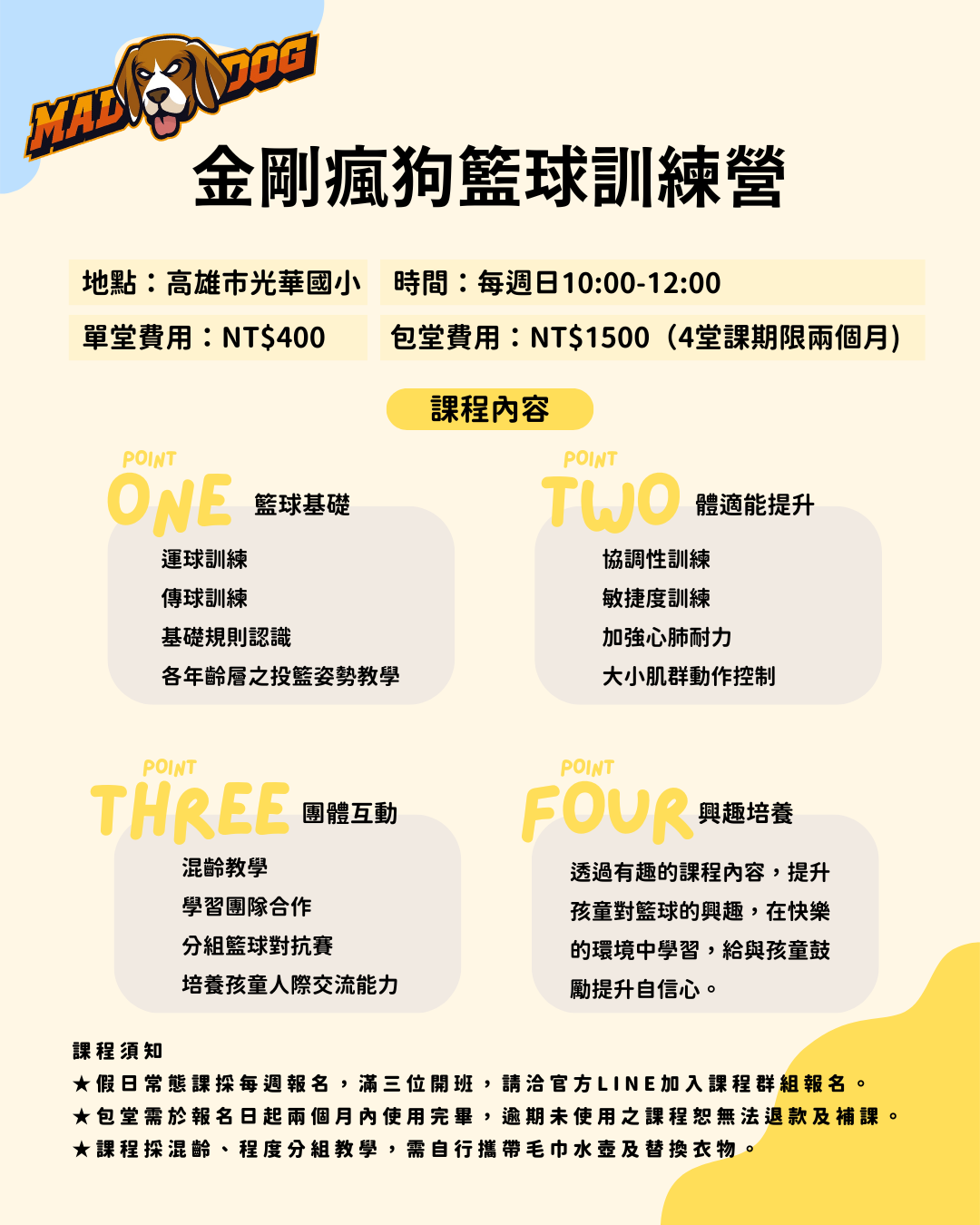 有別於一般籃球訓練我們更強調小朋友在快樂且充滿正向鼓勵的環境中學習,培養小朋友喜歡運動的興趣並從中獲得健康的體格。 課程中除了籃球教學也加入了體適能小遊戲,加強小朋友的心肺適能、反應力、協調性、敏捷度及大小肌群的控制。