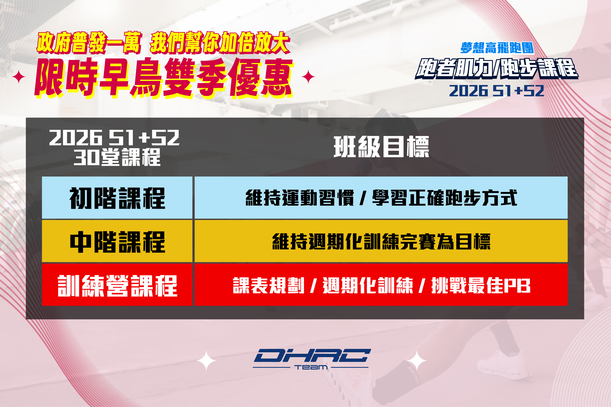 「DHRC夢想高飛跑步課程」 ✩教練群皆為專業運動員出身,我們深知每位跑者都需要不同的課程,因此無論是還沒開始跑步,想要快樂運動、培養每周跑步習慣、順利完成路跑賽事,或是目標是初馬、想要突破自己的菁英跑者都能找到不同的課程✩