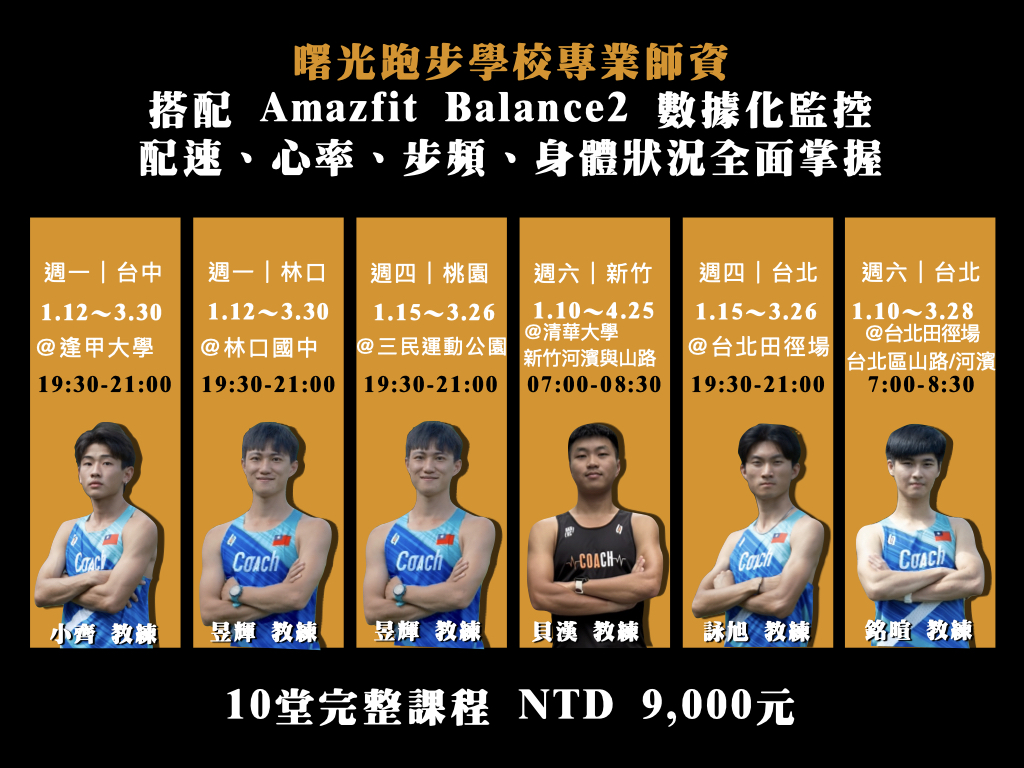 (一) 因運動安全考量,如未配戴適合之運動裝備,教練團有權禁止學員參與該活動,本課程學員將使用Amazfit手錶;另因應課程訓練需求,課程地點將依氣候及課程內容彈性更換。