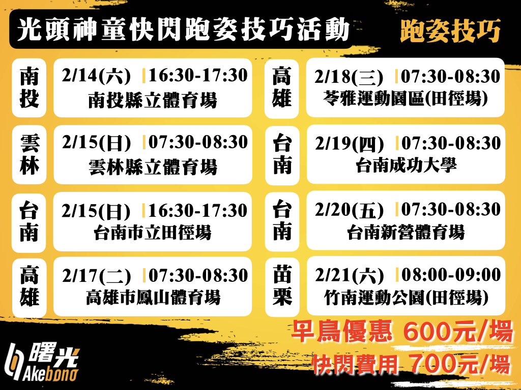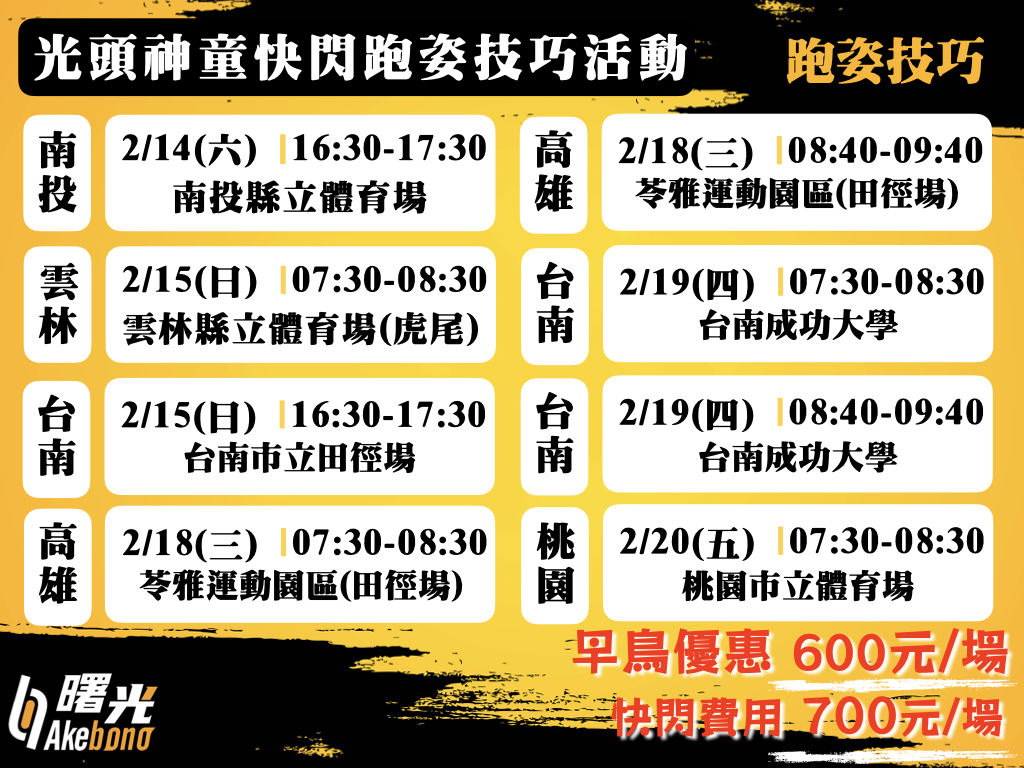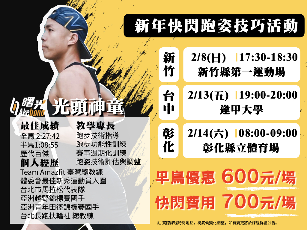 ❤️跑姿技巧教學(每場活動限量招收)❤️早鳥費用600元P.s本活動限量招收報名者,如報名選項無法報名則已額滿。🏅參與活動者每場活動將抽出三位贈送精美禮物。