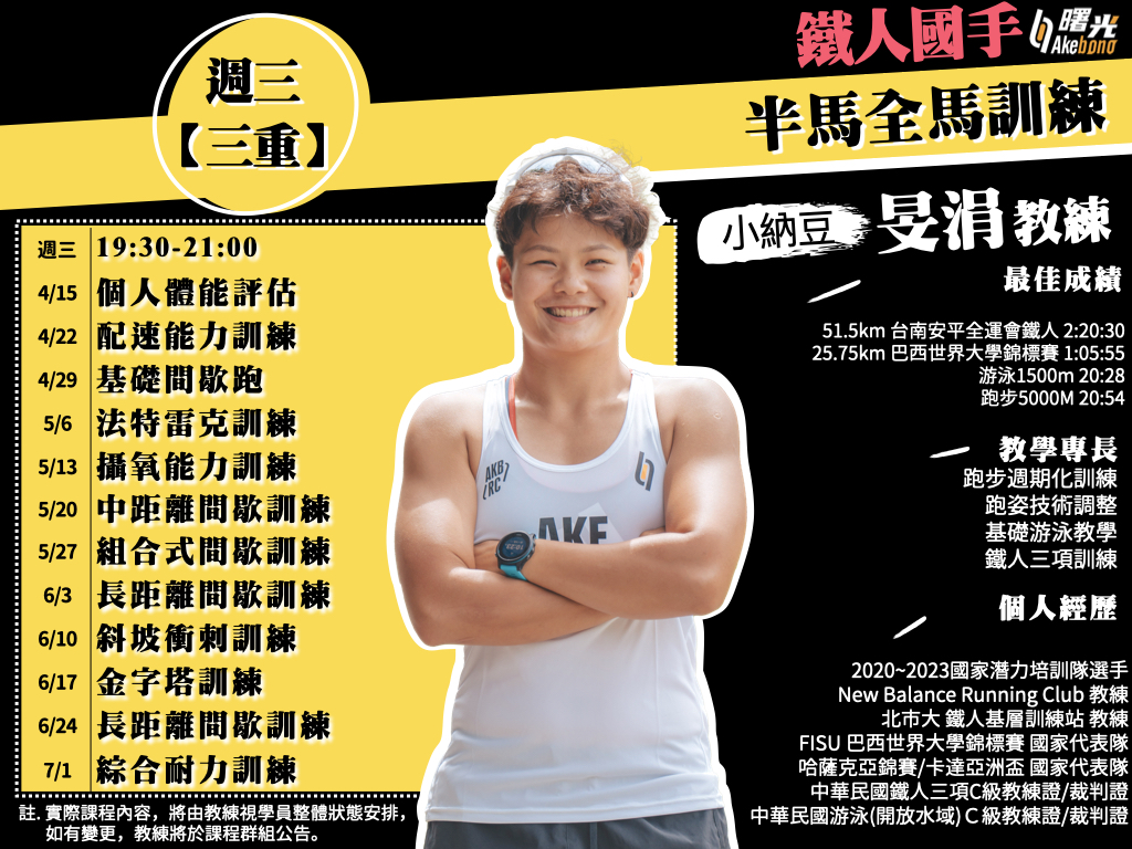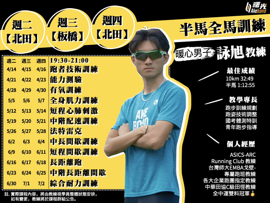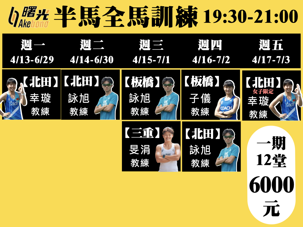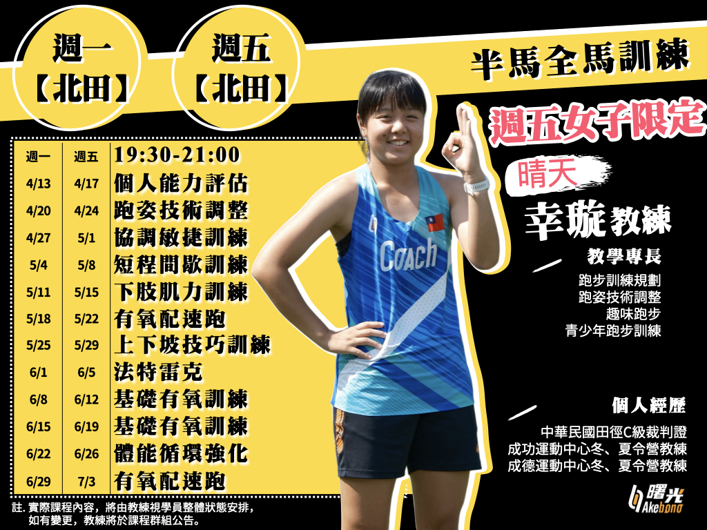 【Akebono曙光跑步學校 全馬半馬訓練系列】 想挑戰半馬、全馬賽事,你需要更強的有氧和肌耐力,並熟悉因應不同地勢、身體狀況來調整跑步方式,讓你能夠『調控長距離跑步的身體變化』、『跑得更遠更穩』!
