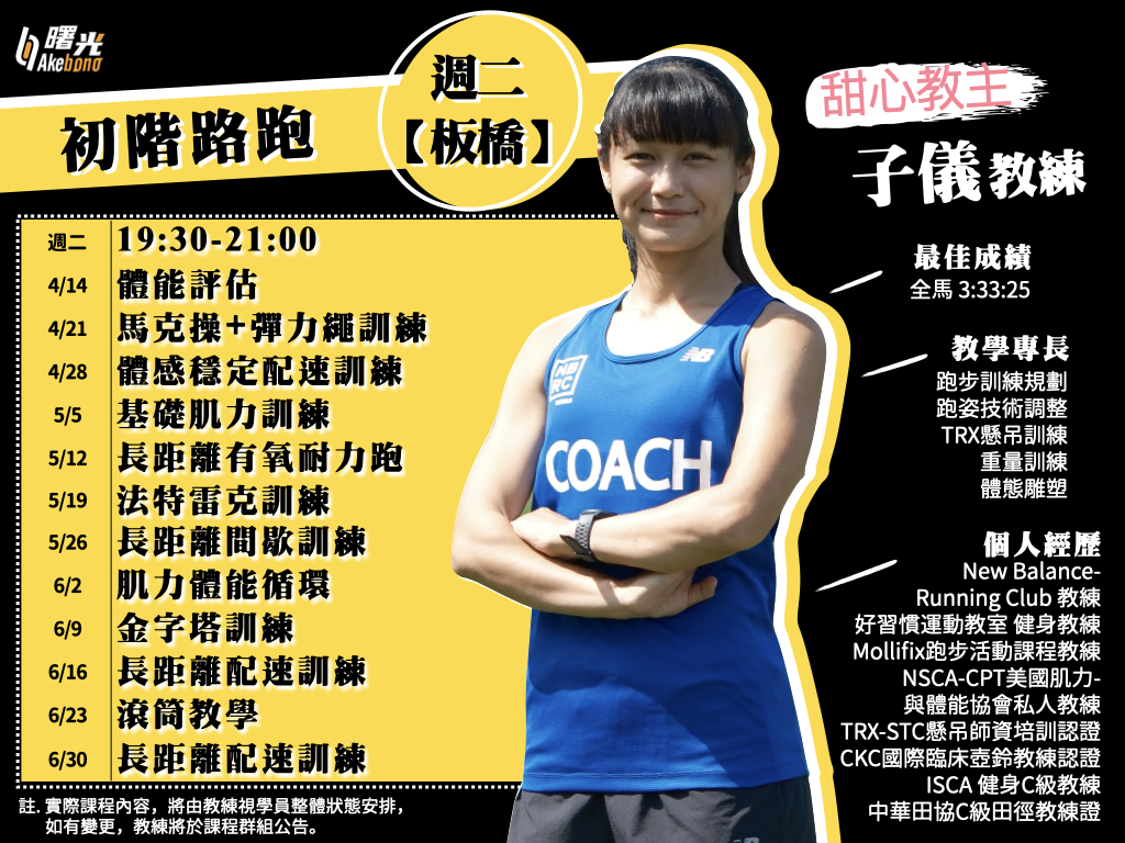 專為初學者設計的跑步班!提供完整基礎訓練,讓初學者了解跑步的各個面向,帶你輕鬆養成運動習慣,一起享受跑步樂趣,不只跑得開心,還能越跑越省力。跑步入門者、喜歡無壓力、開心運動者,從0開始,循序漸進逐步養成運動習慣️,建立正確跑步知識,避免運動