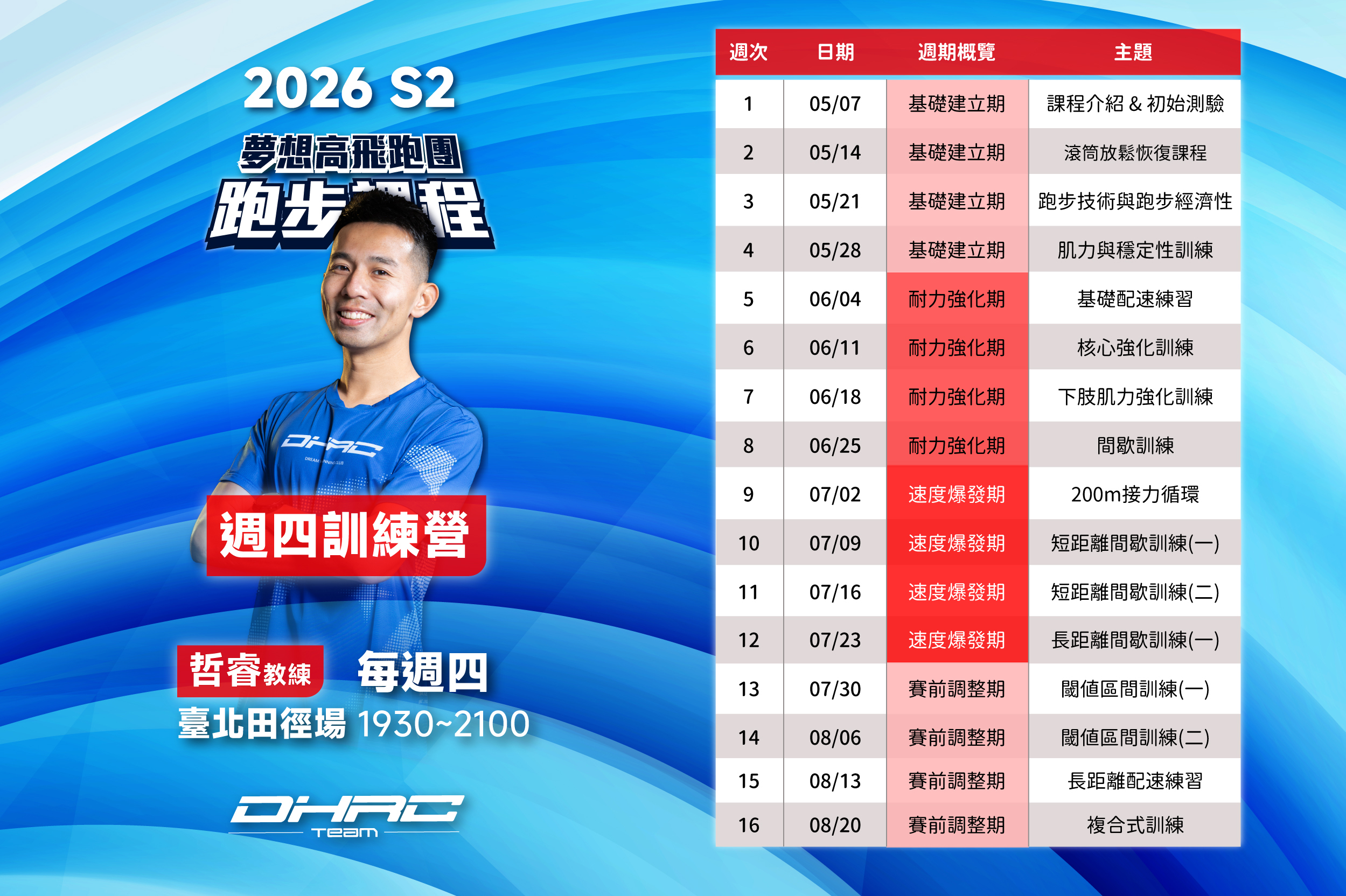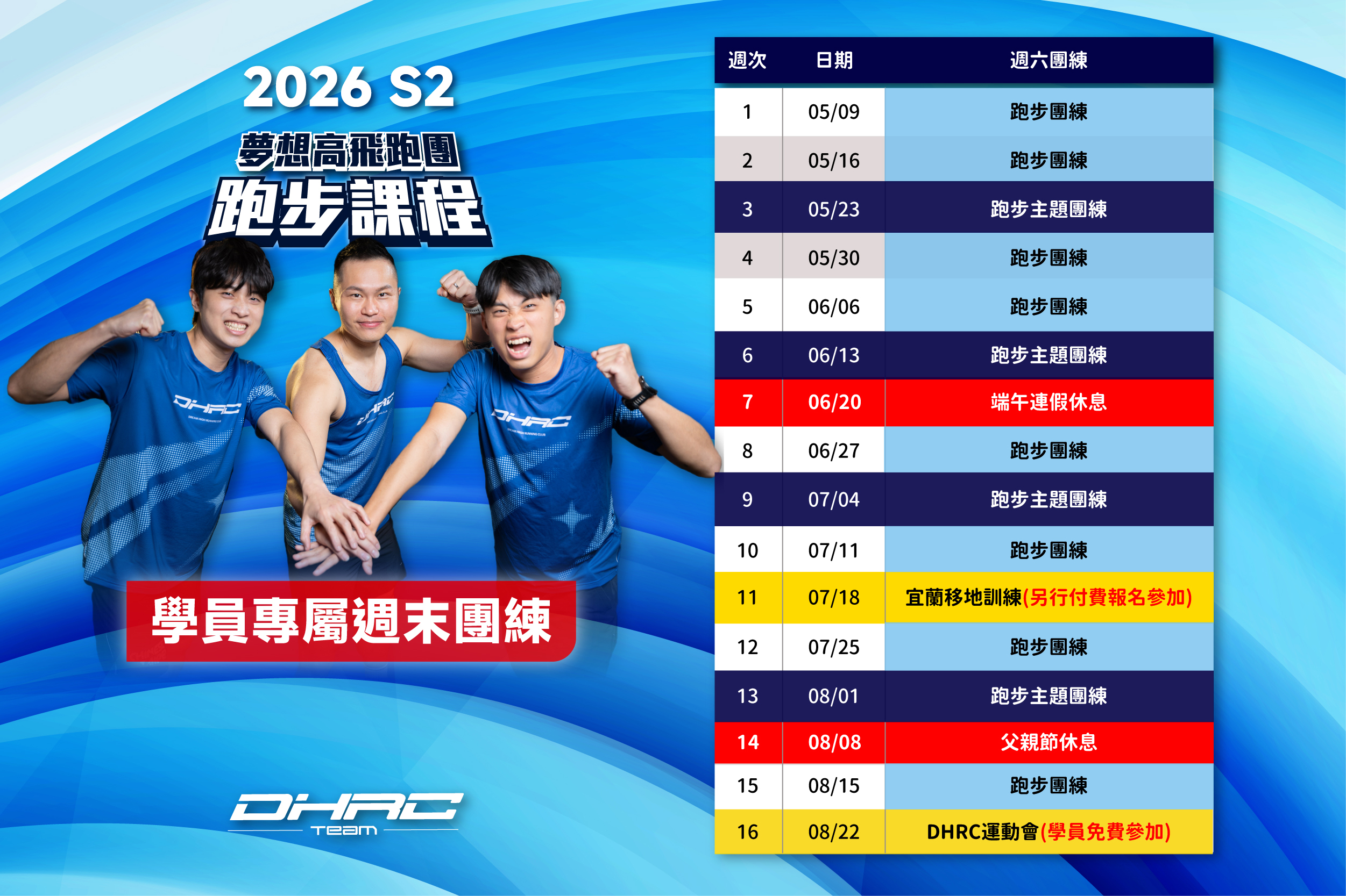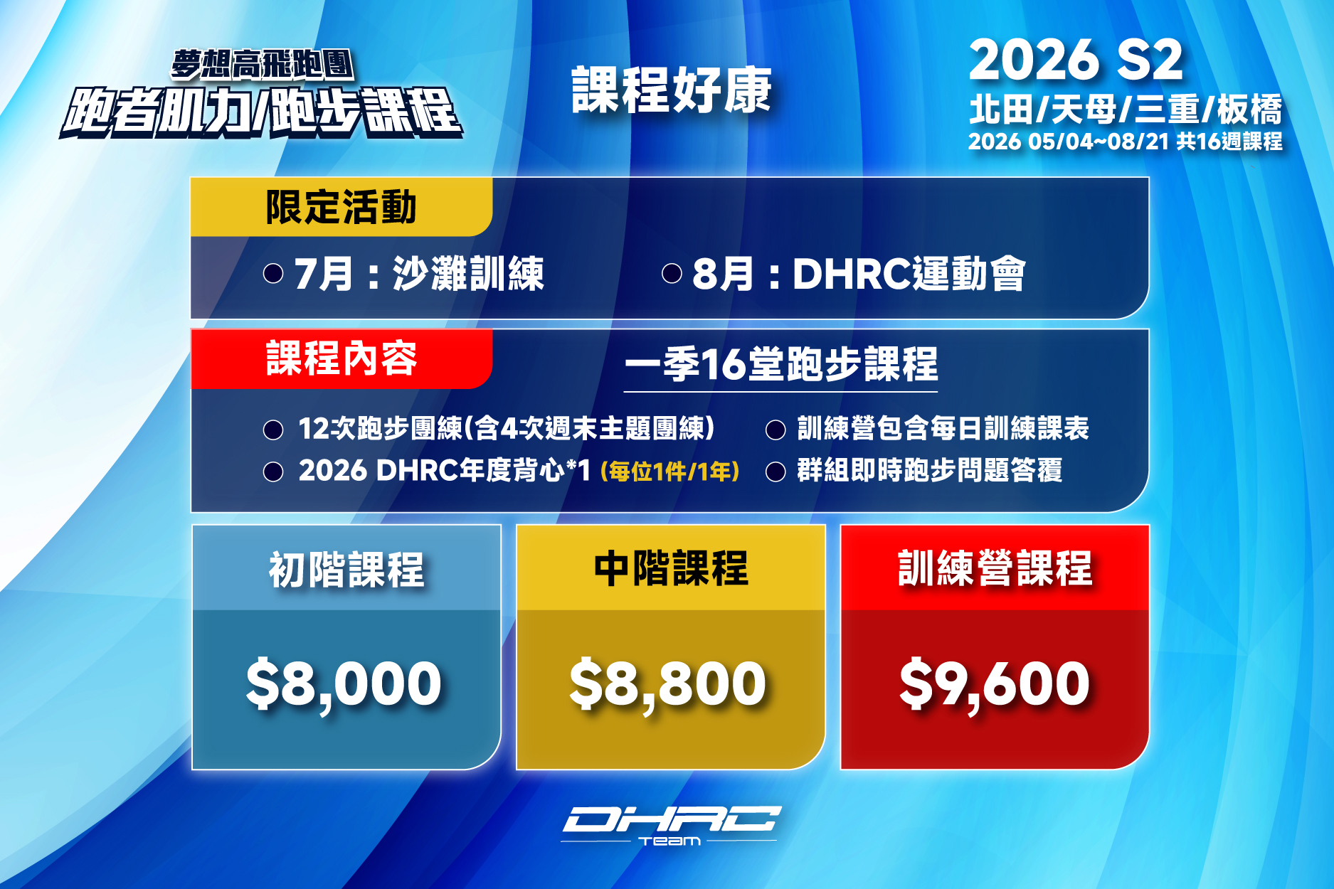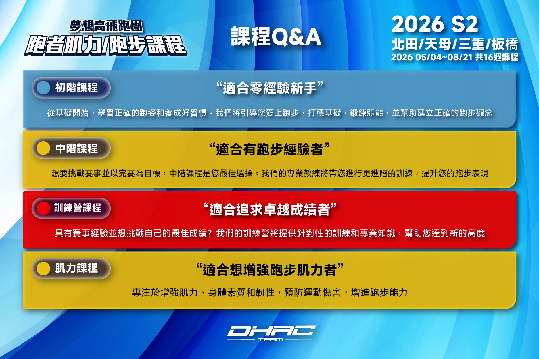 「DHRC夢想高飛跑步課程」 ✩教練群皆為專業運動員出身,我們深知每位跑者都需要不同的課程,因此無論是還沒開始跑步,想要快樂運動、培養每周跑步習慣、順利完成路跑賽事,或是目標是初馬、想要突破自己的菁英跑者都能找到不同的課程✩