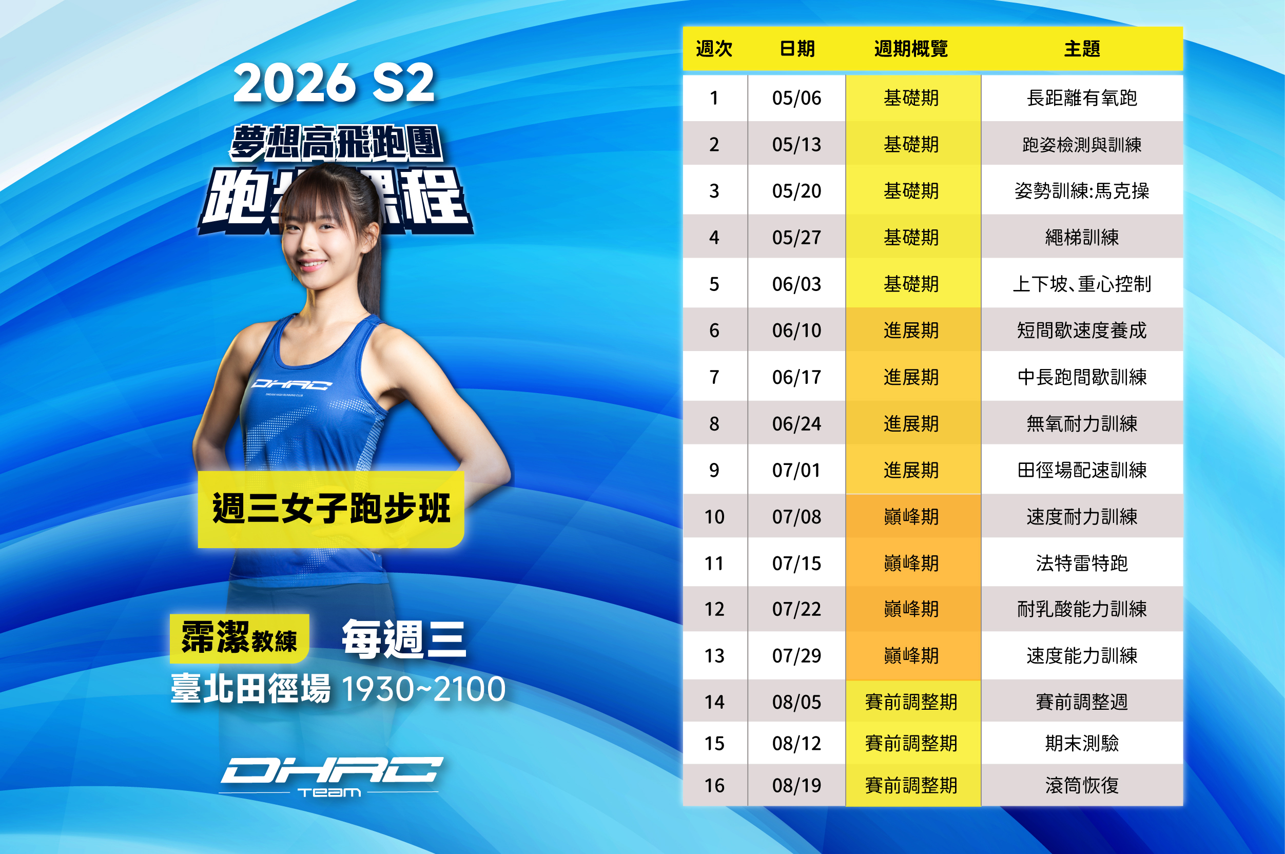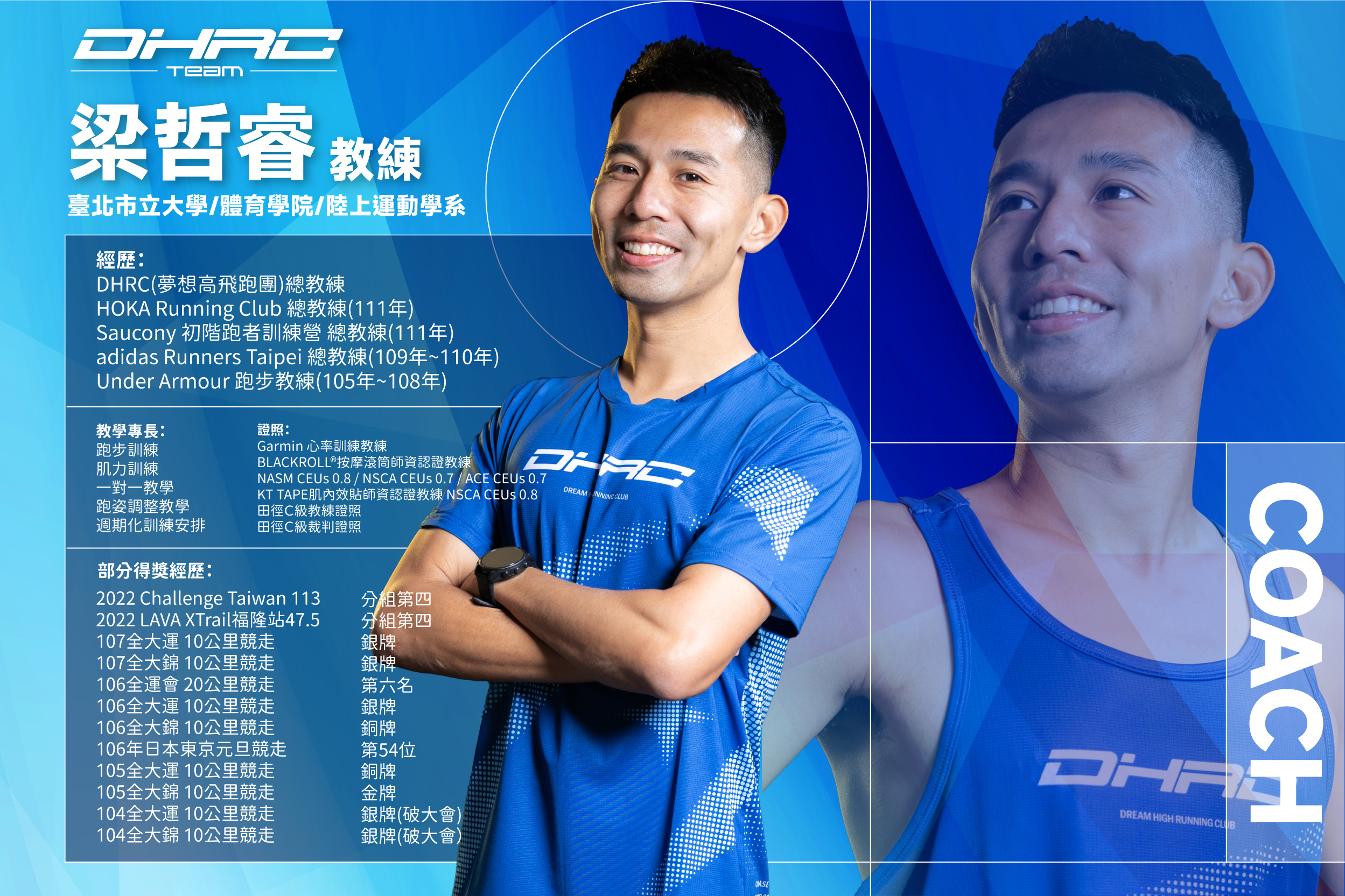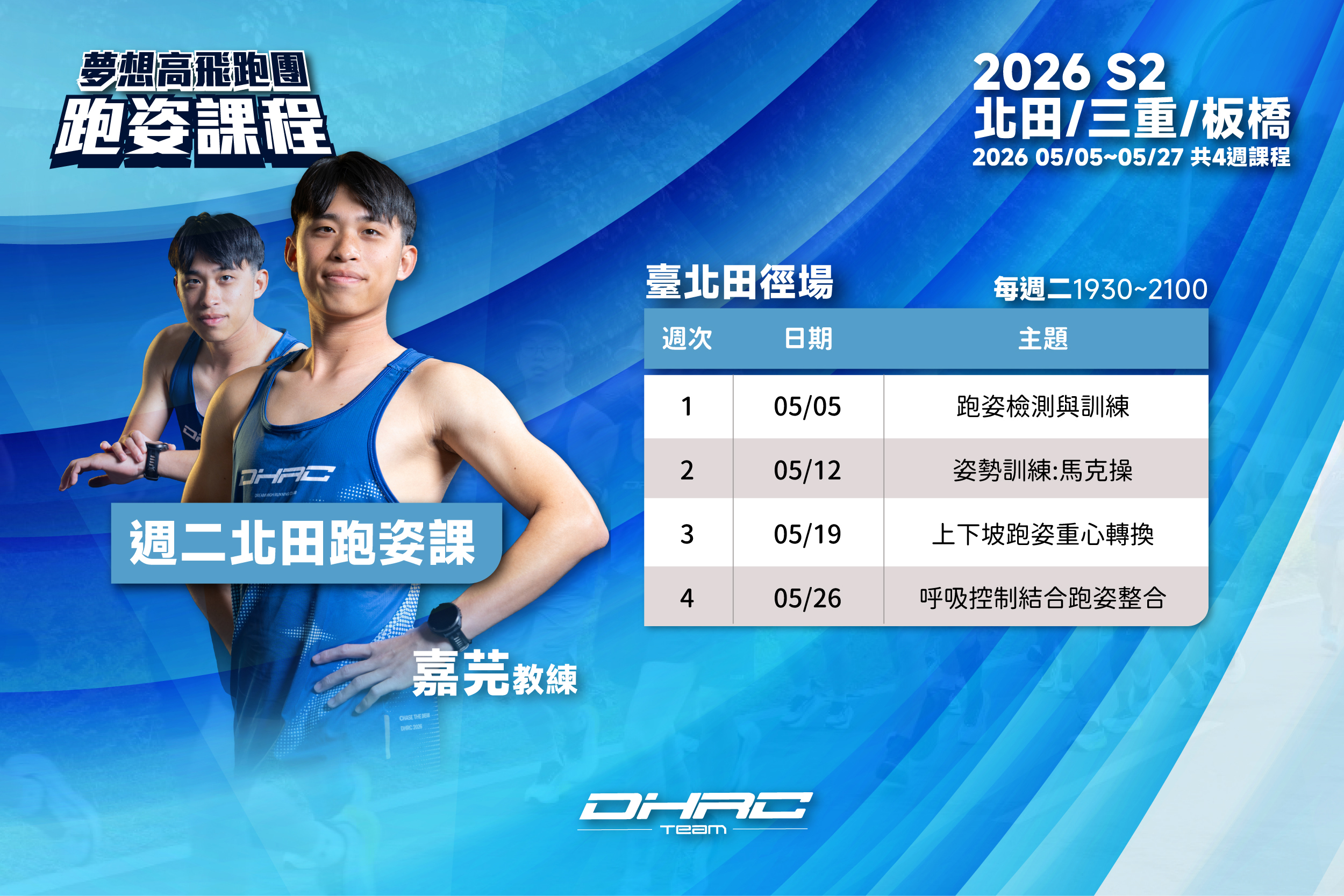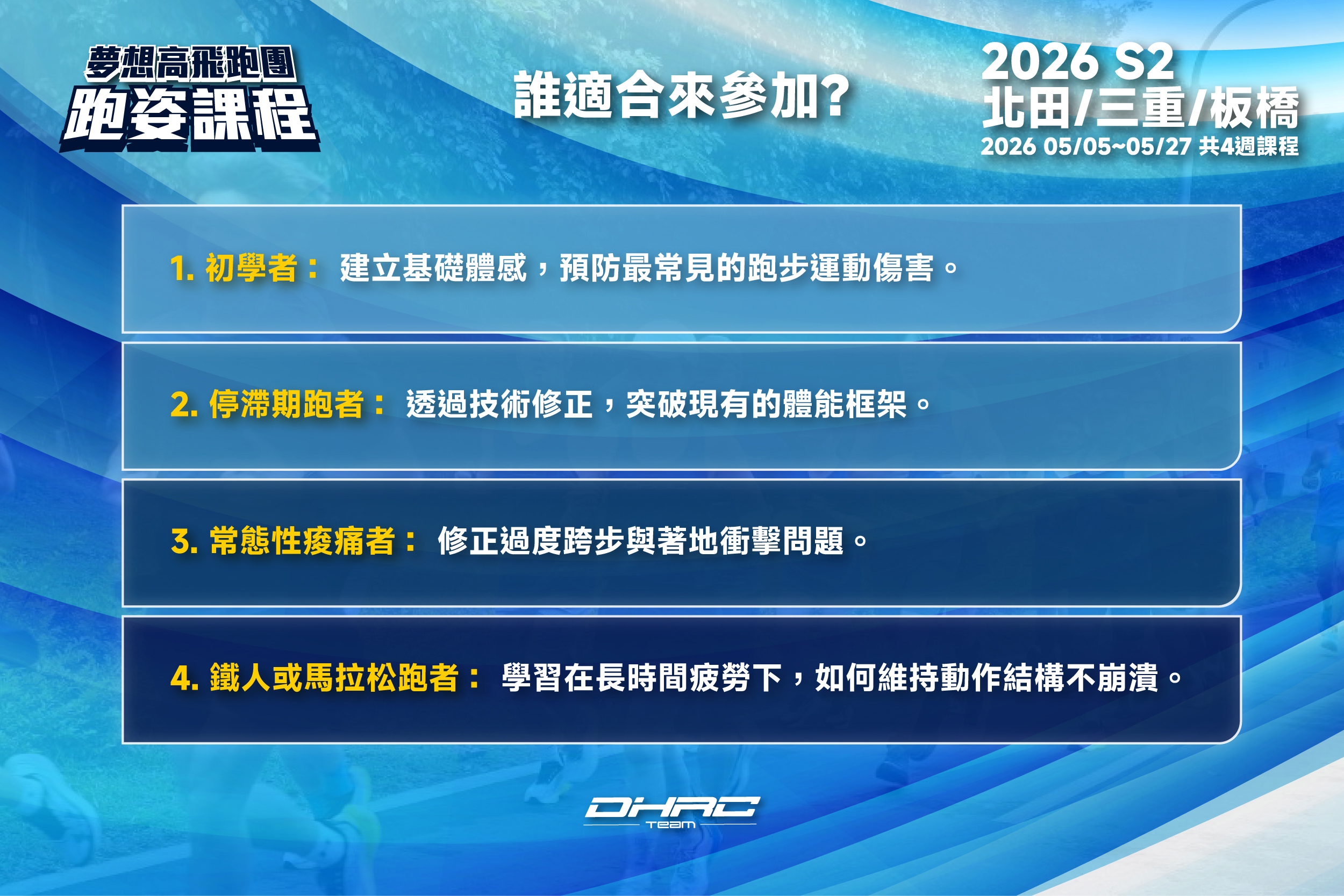 「DHRC夢想高飛跑步課程」 ✩教練群皆為專業運動員出身,我們深知每位跑者都需要不同的課程,因此無論是還沒開始跑步,想要快樂運動、培養每周跑步習慣、順利完成路跑賽事,或是目標是初馬、想要突破自己的菁英跑者都能找到不同的課程✩