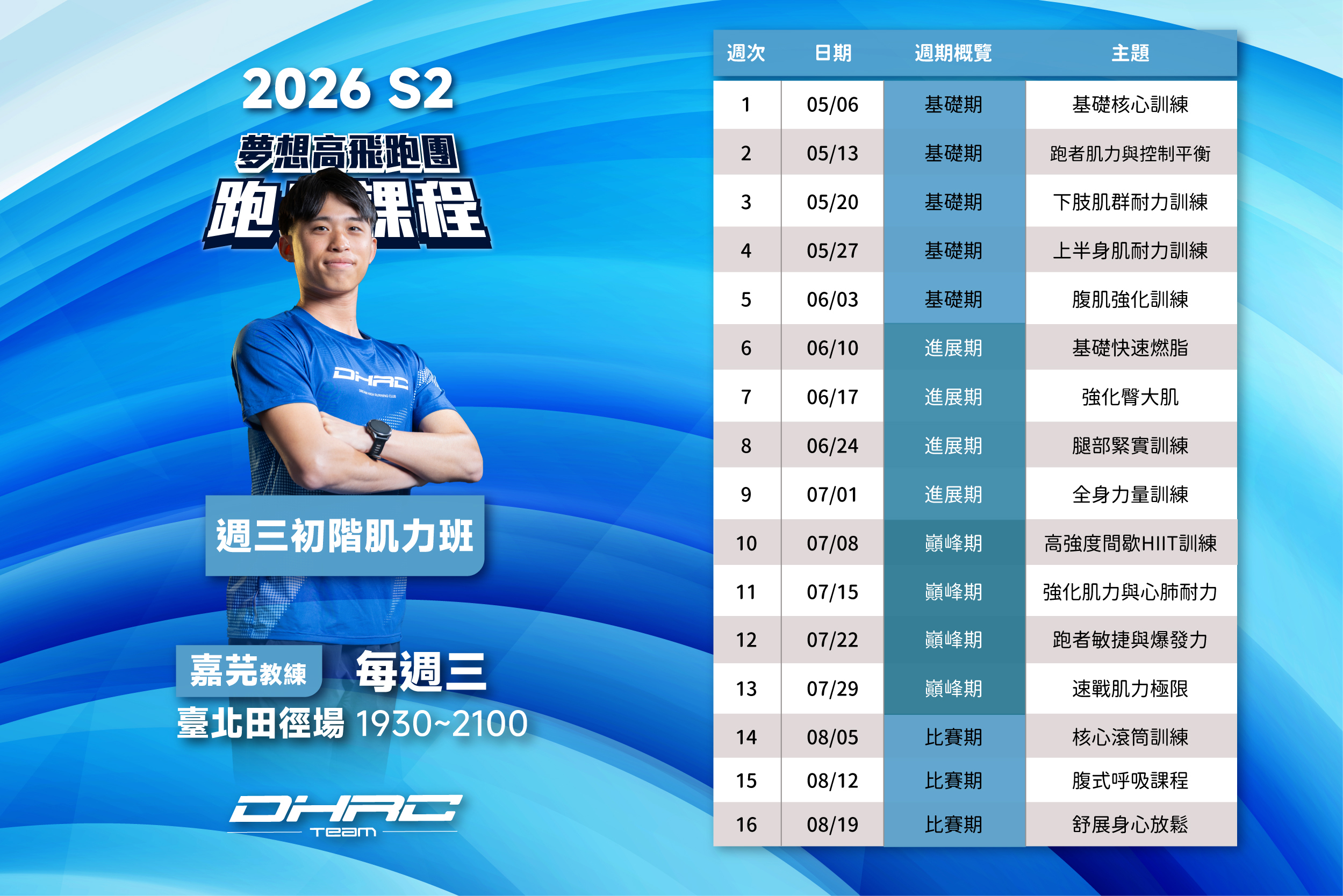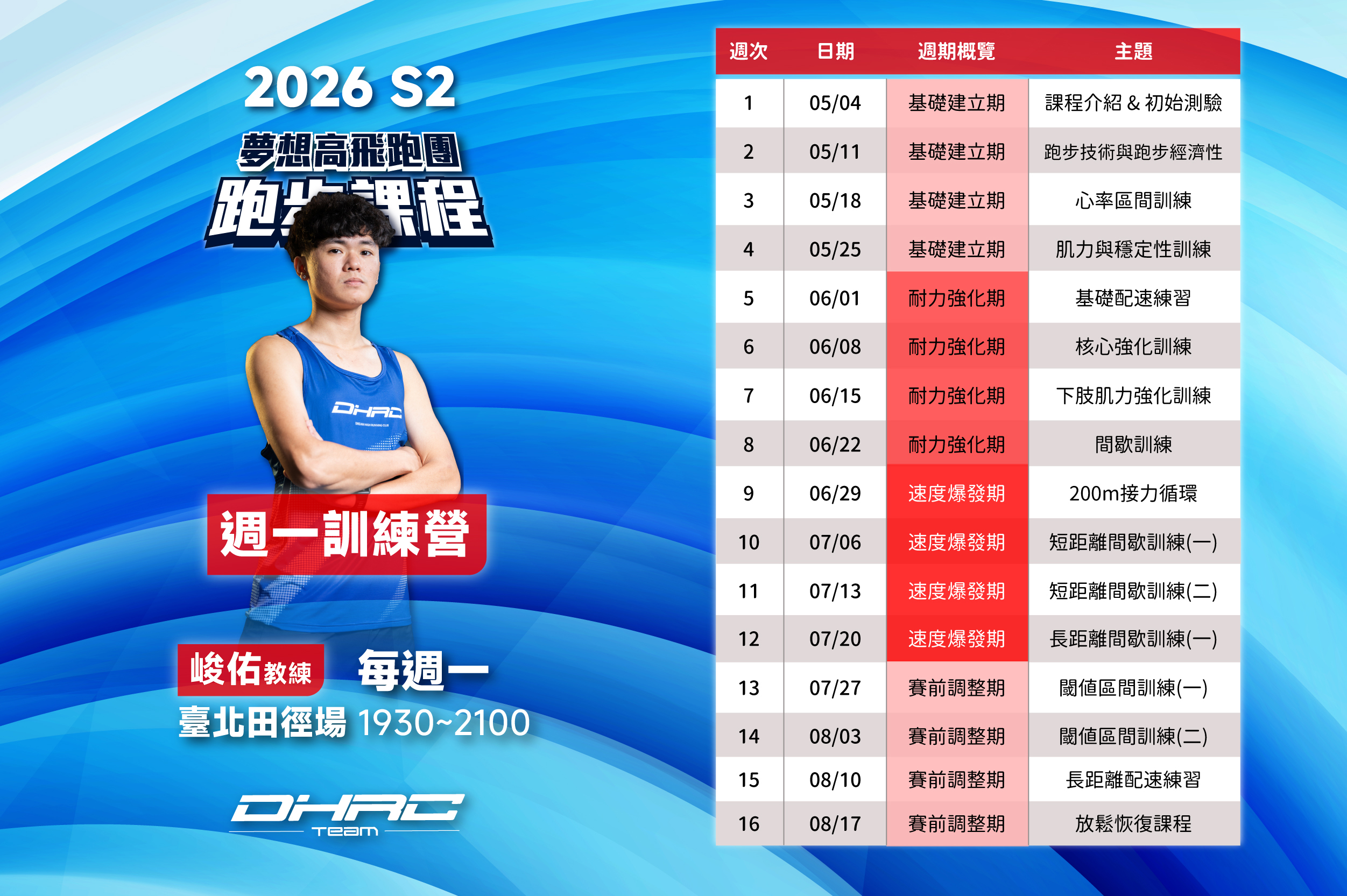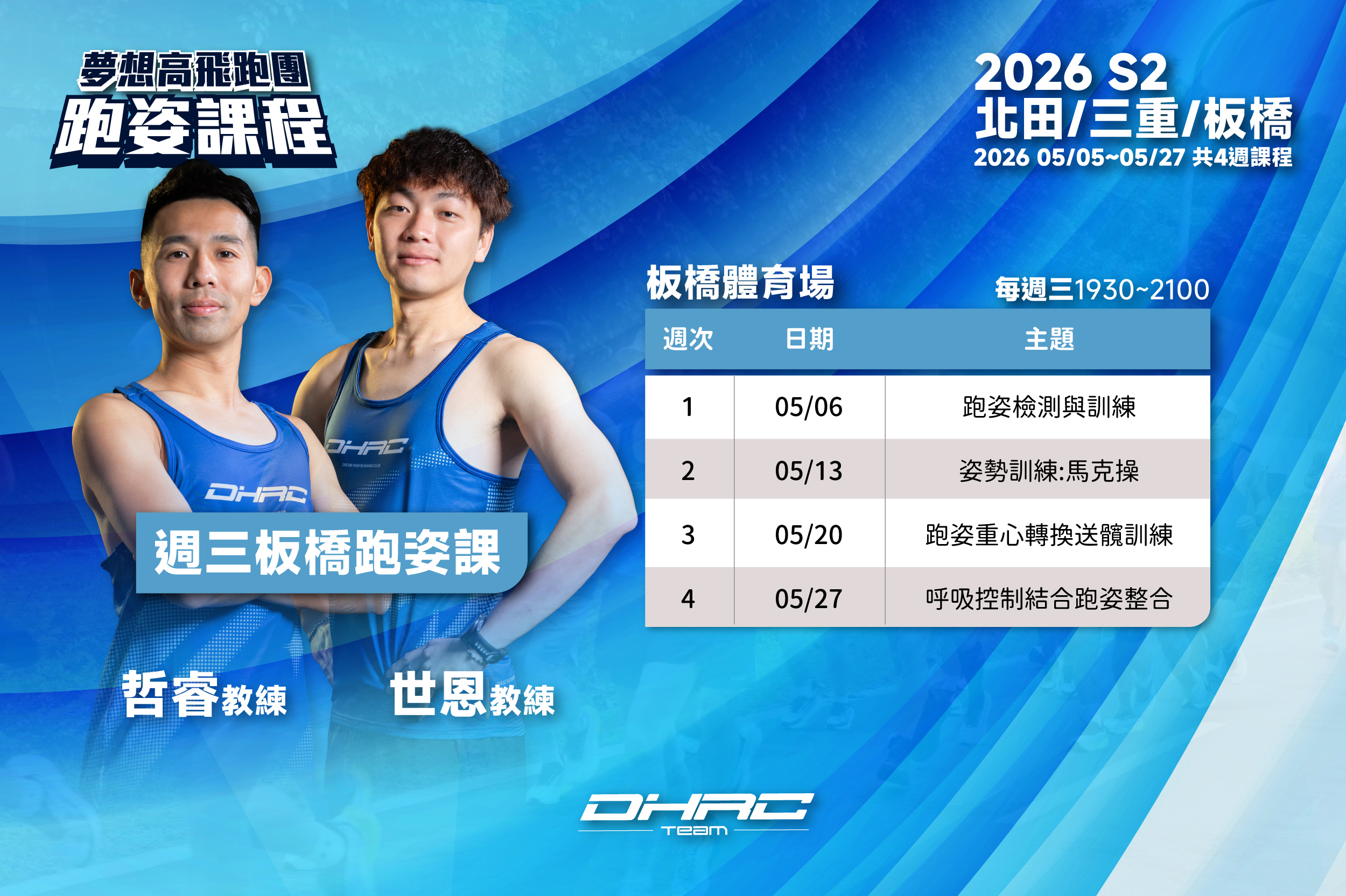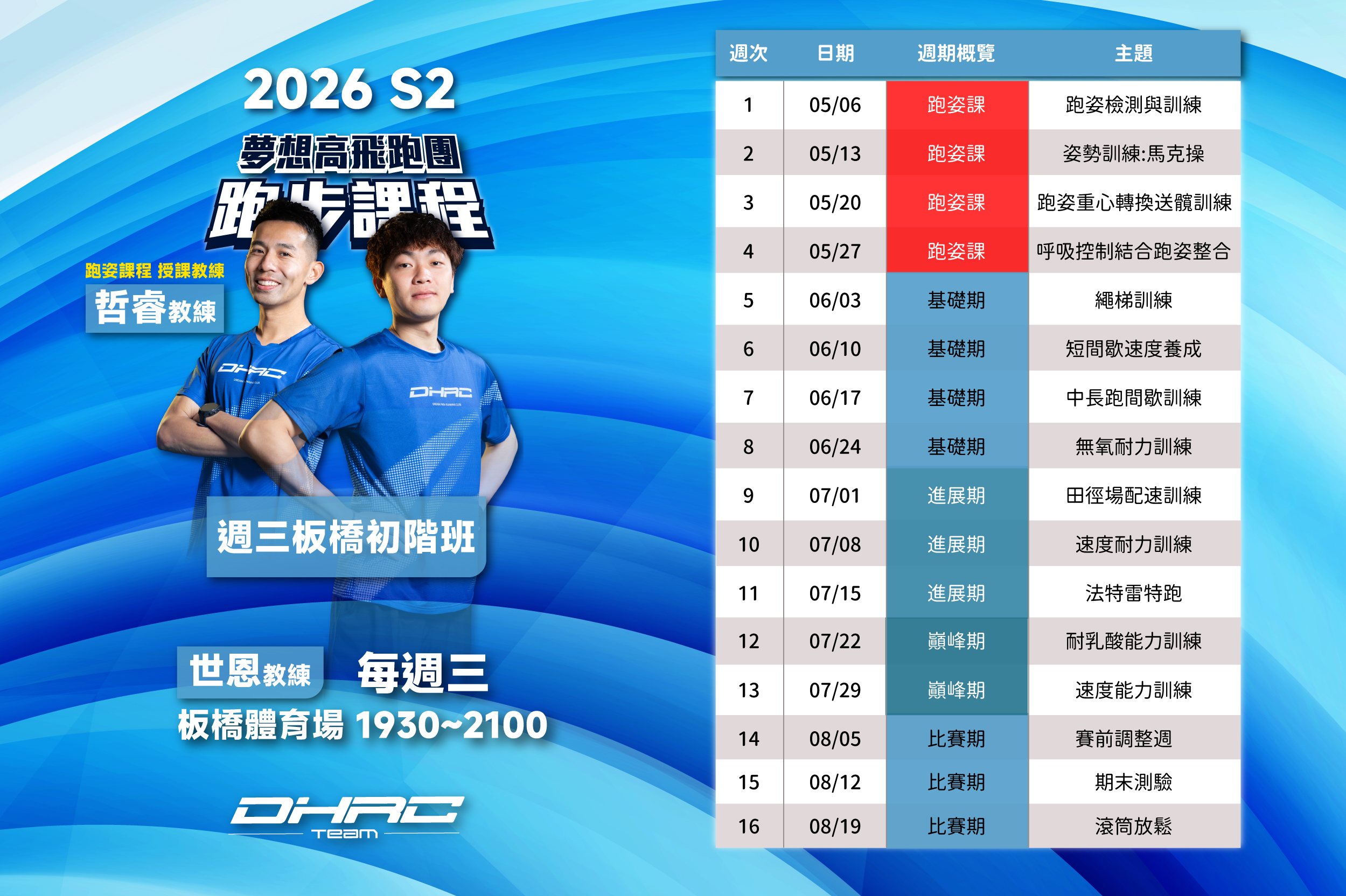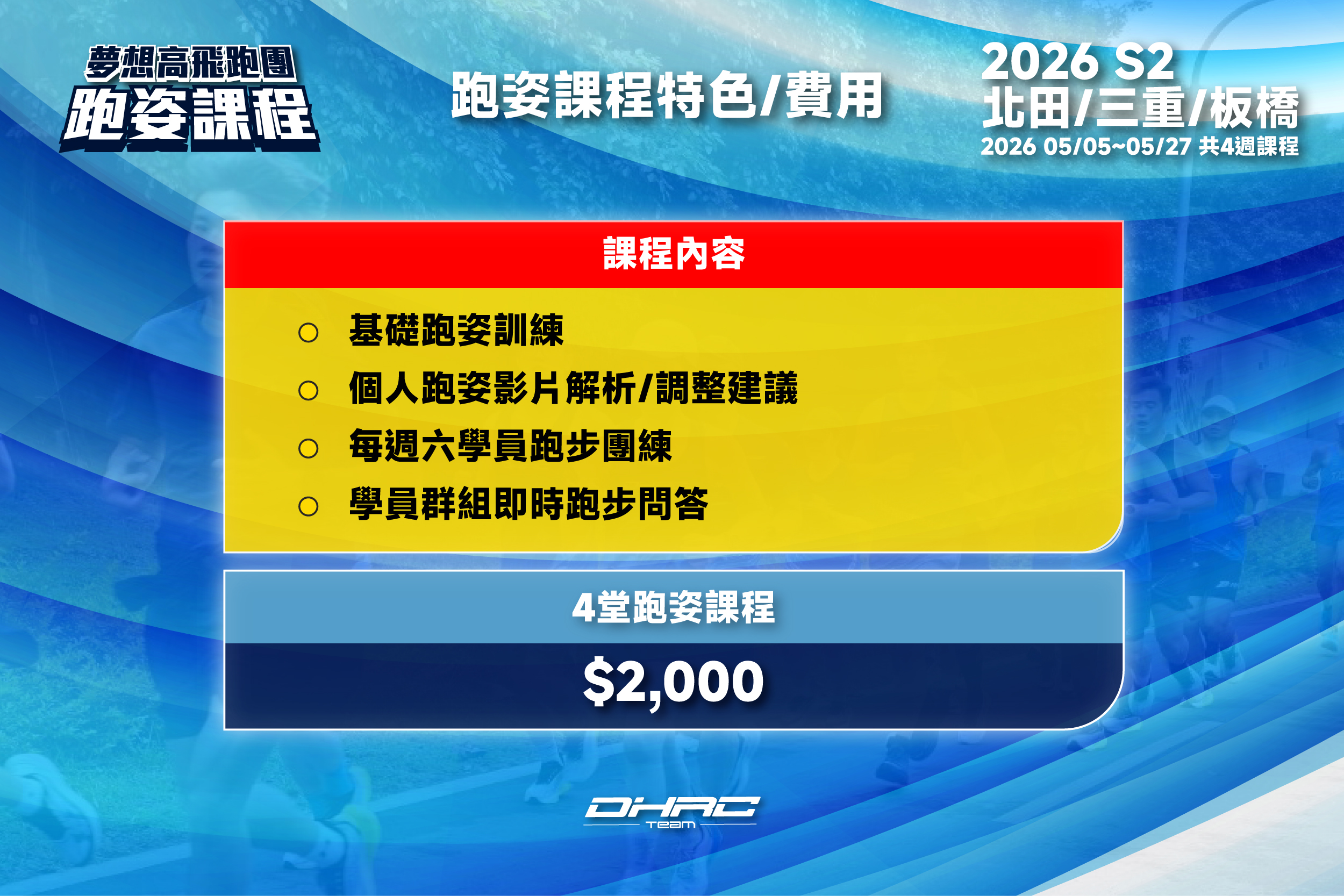 「DHRC夢想高飛跑步課程」 ✩教練群皆為專業運動員出身,我們深知每位跑者都需要不同的課程,因此無論是還沒開始跑步,想要快樂運動、培養每周跑步習慣、順利完成路跑賽事,或是目標是初馬、想要突破自己的菁英跑者都能找到不同的課程✩