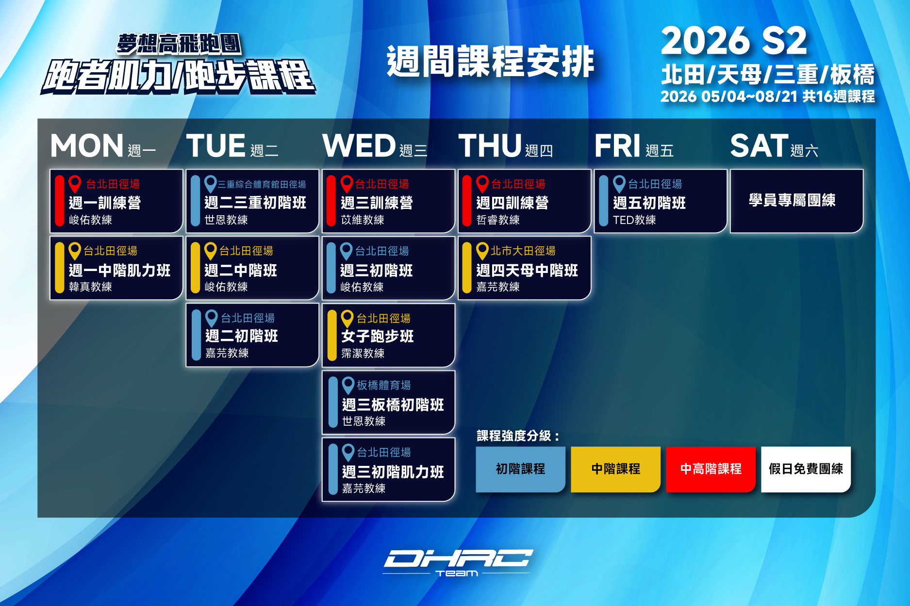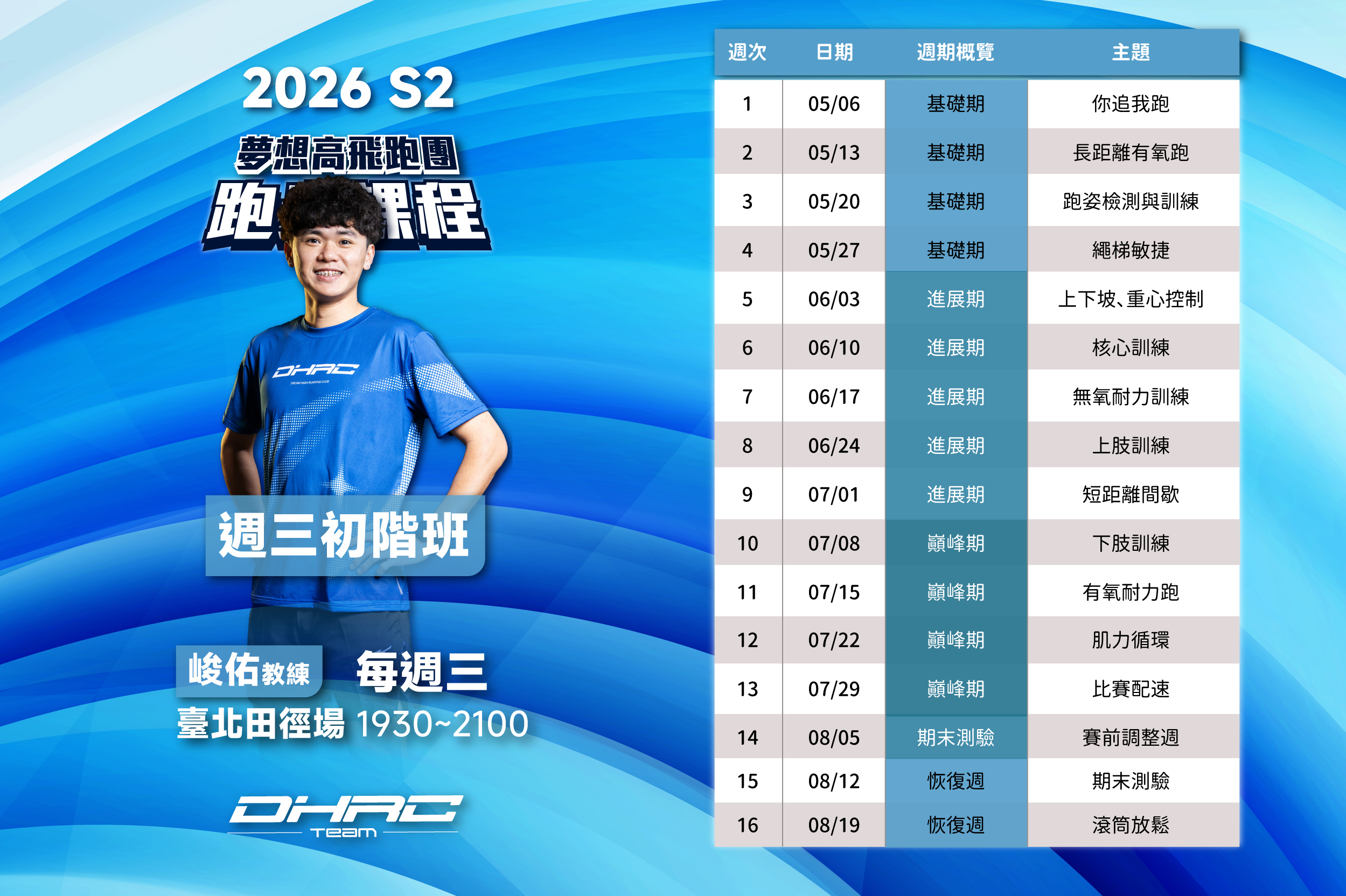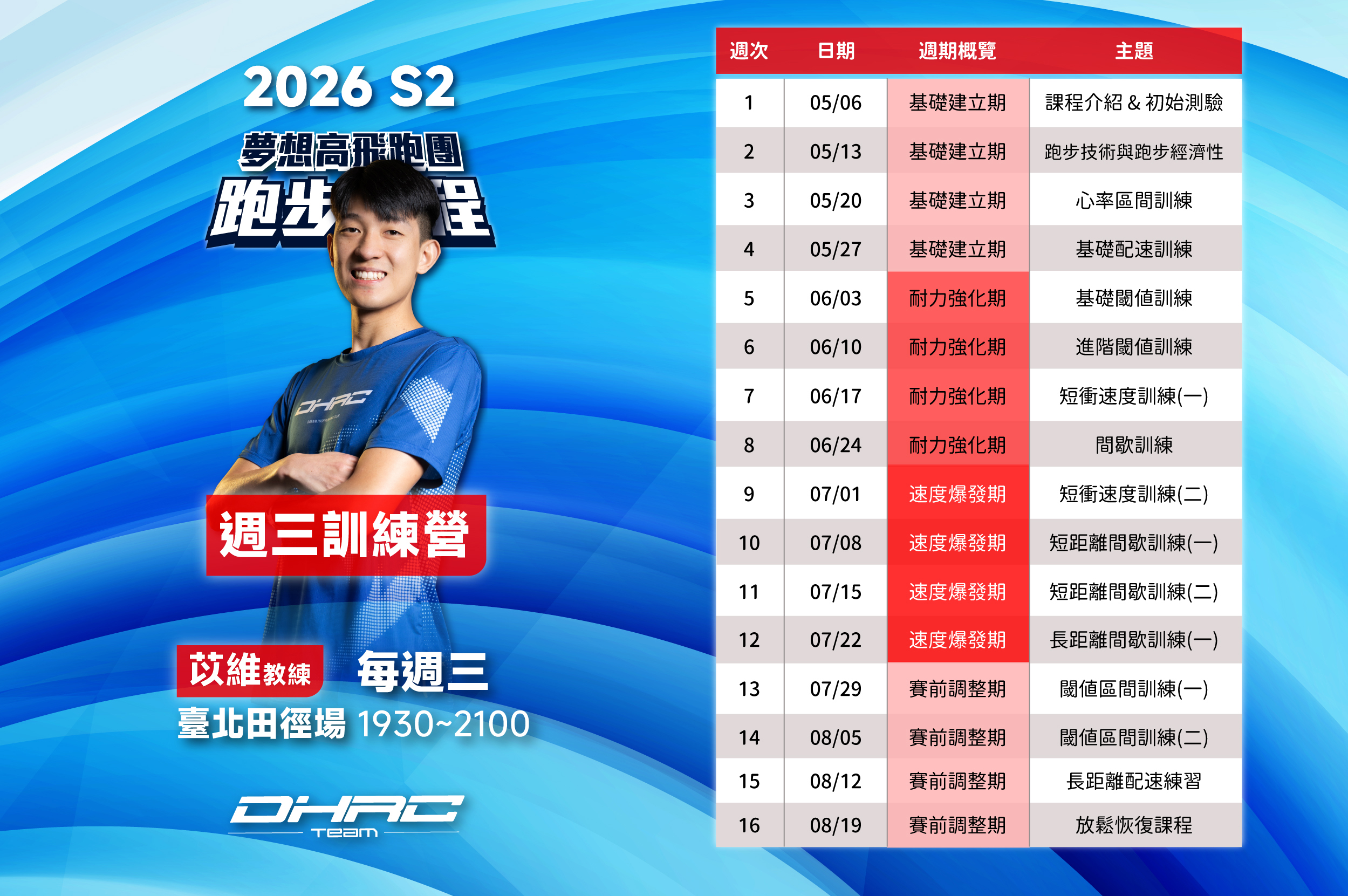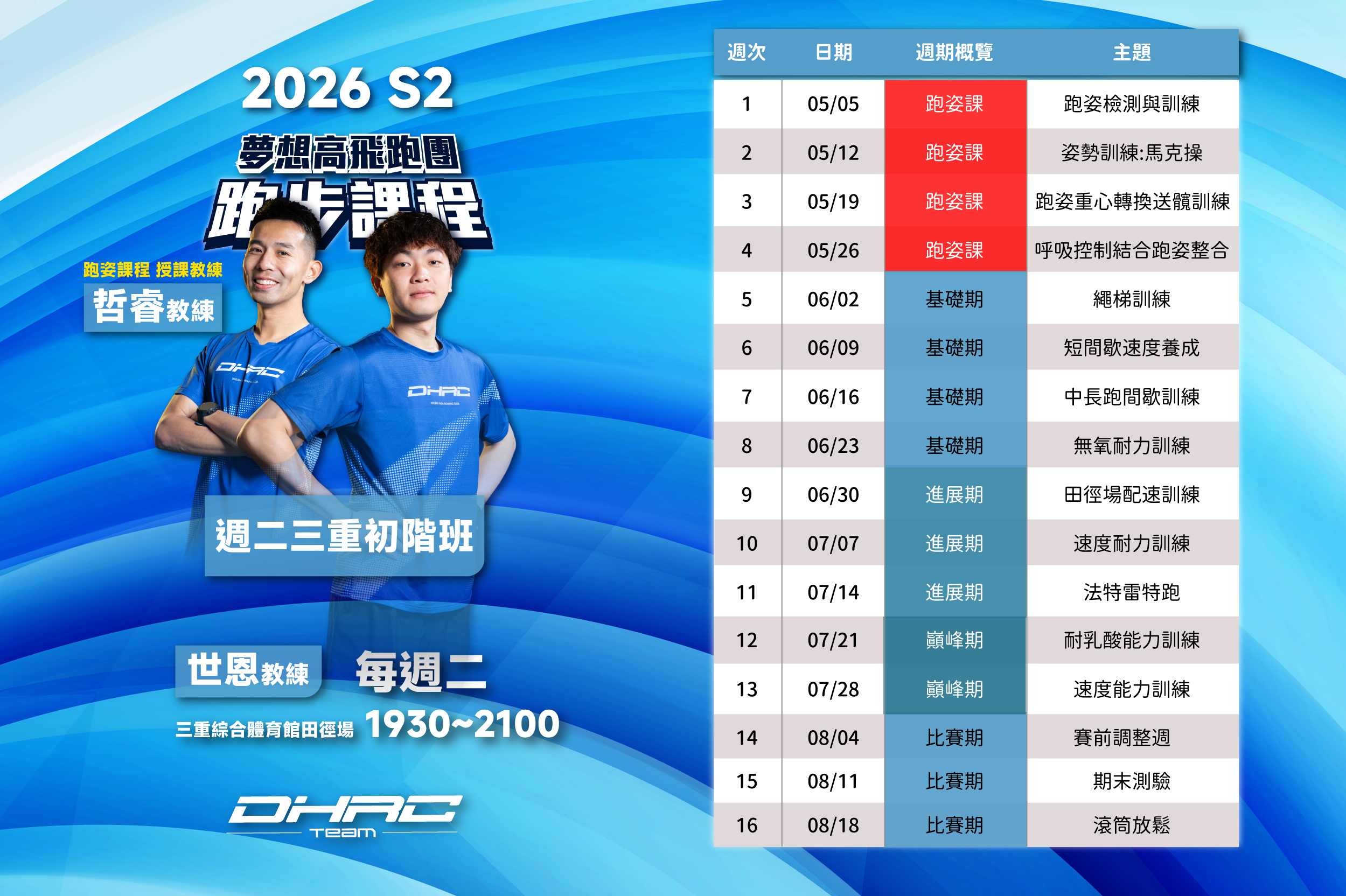 「DHRC夢想高飛跑步課程」 ✩教練群皆為專業運動員出身,我們深知每位跑者都需要不同的課程,因此無論是還沒開始跑步,想要快樂運動、培養每周跑步習慣、順利完成路跑賽事,或是目標是初馬、想要突破自己的菁英跑者都能找到不同的課程✩
