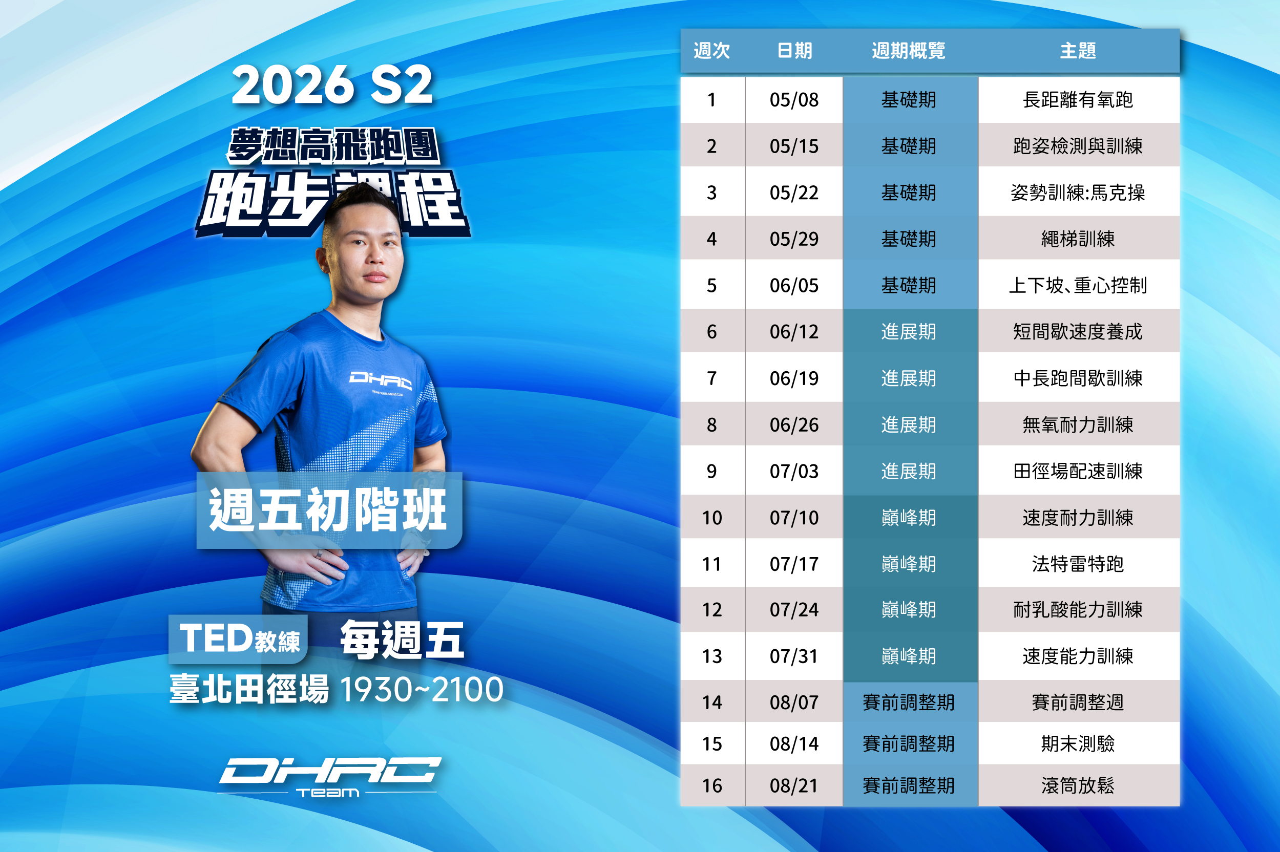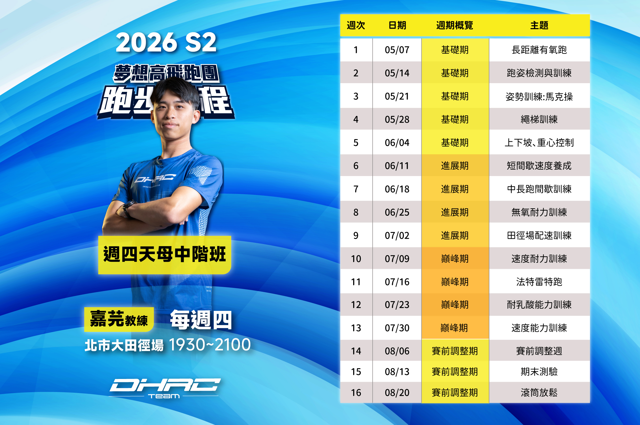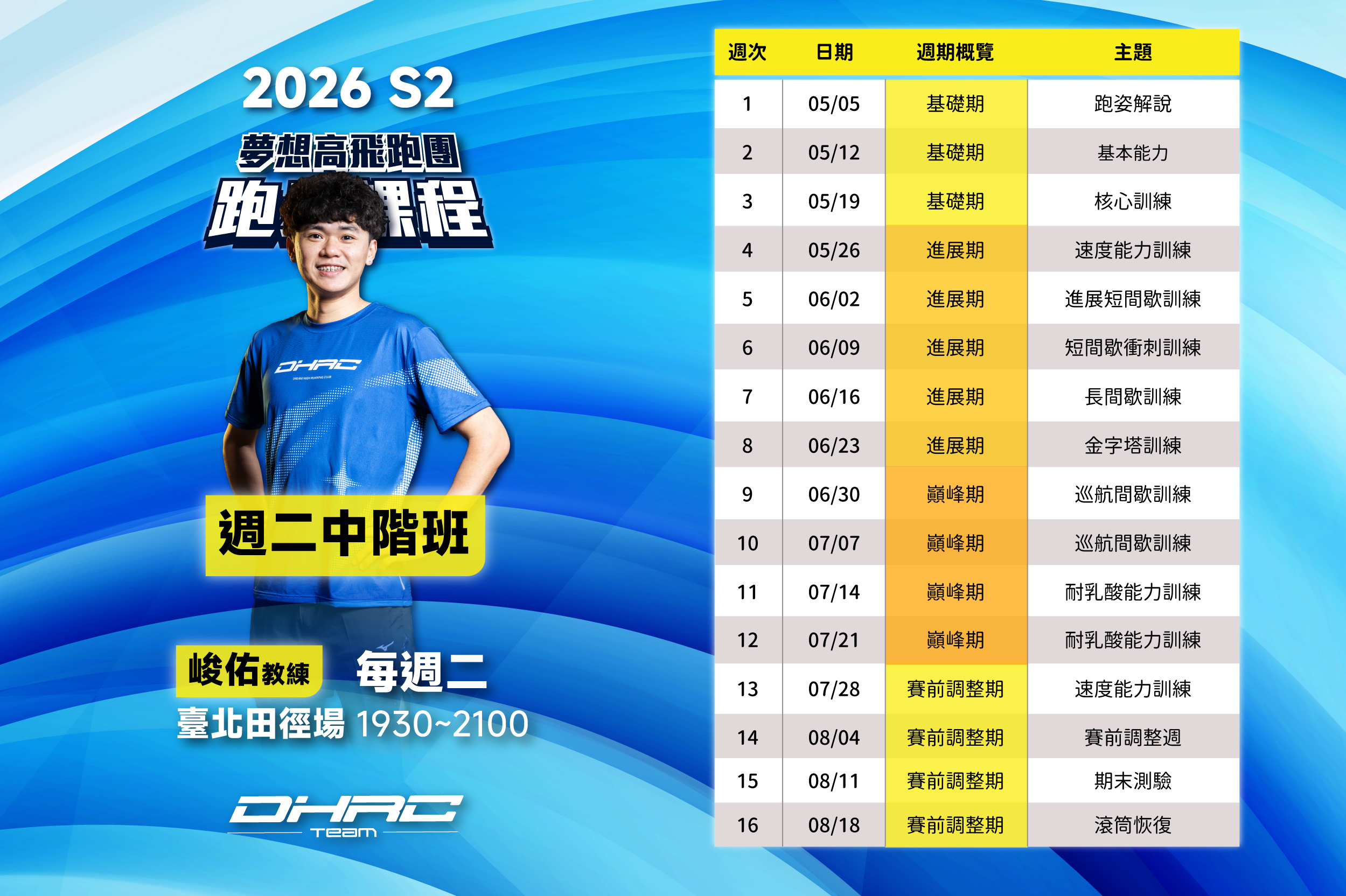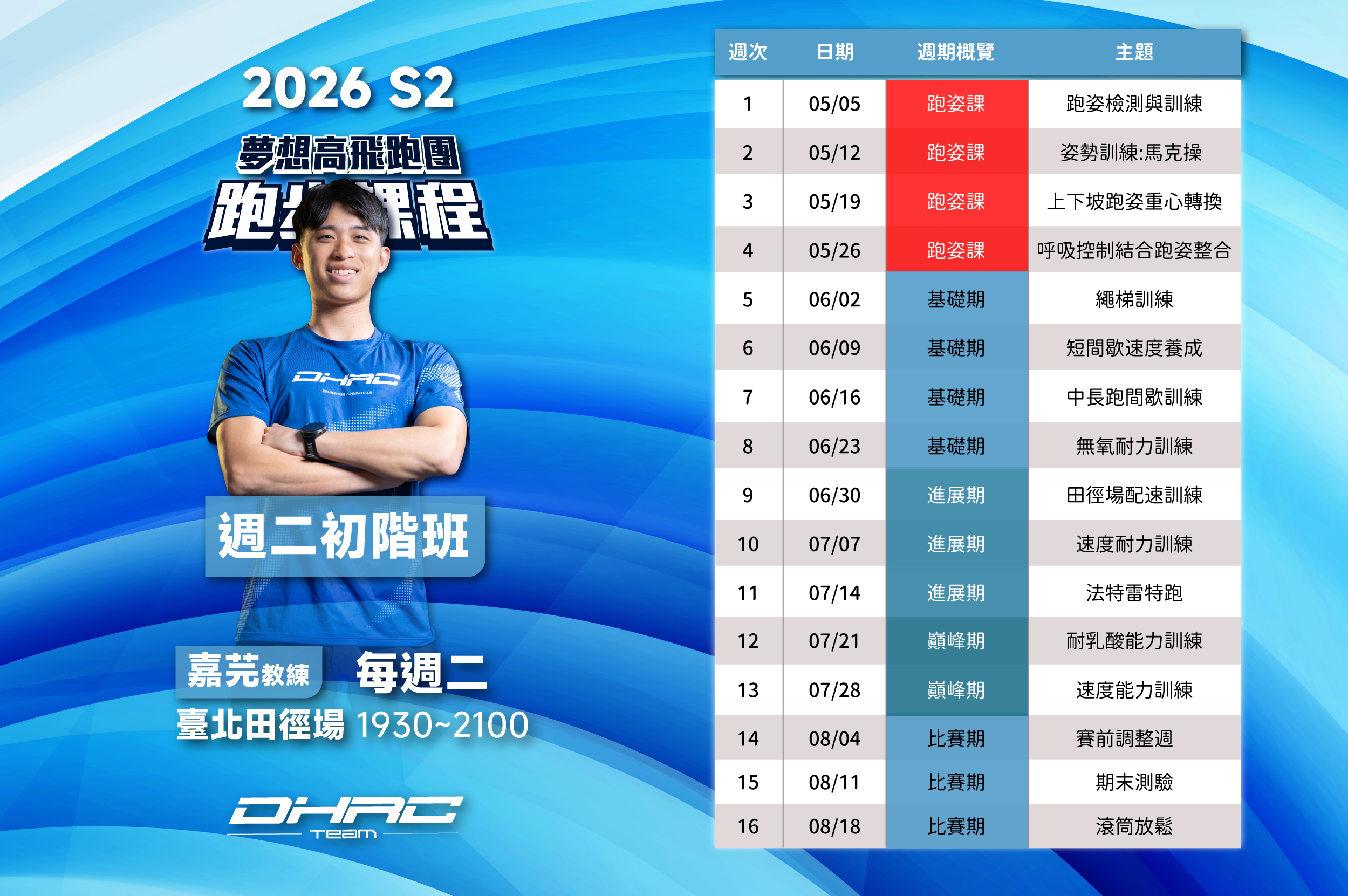 「DHRC夢想高飛跑步課程」 ✩教練群皆為專業運動員出身,我們深知每位跑者都需要不同的課程,因此無論是還沒開始跑步,想要快樂運動、培養每周跑步習慣、順利完成路跑賽事,或是目標是初馬、想要突破自己的菁英跑者都能找到不同的課程✩