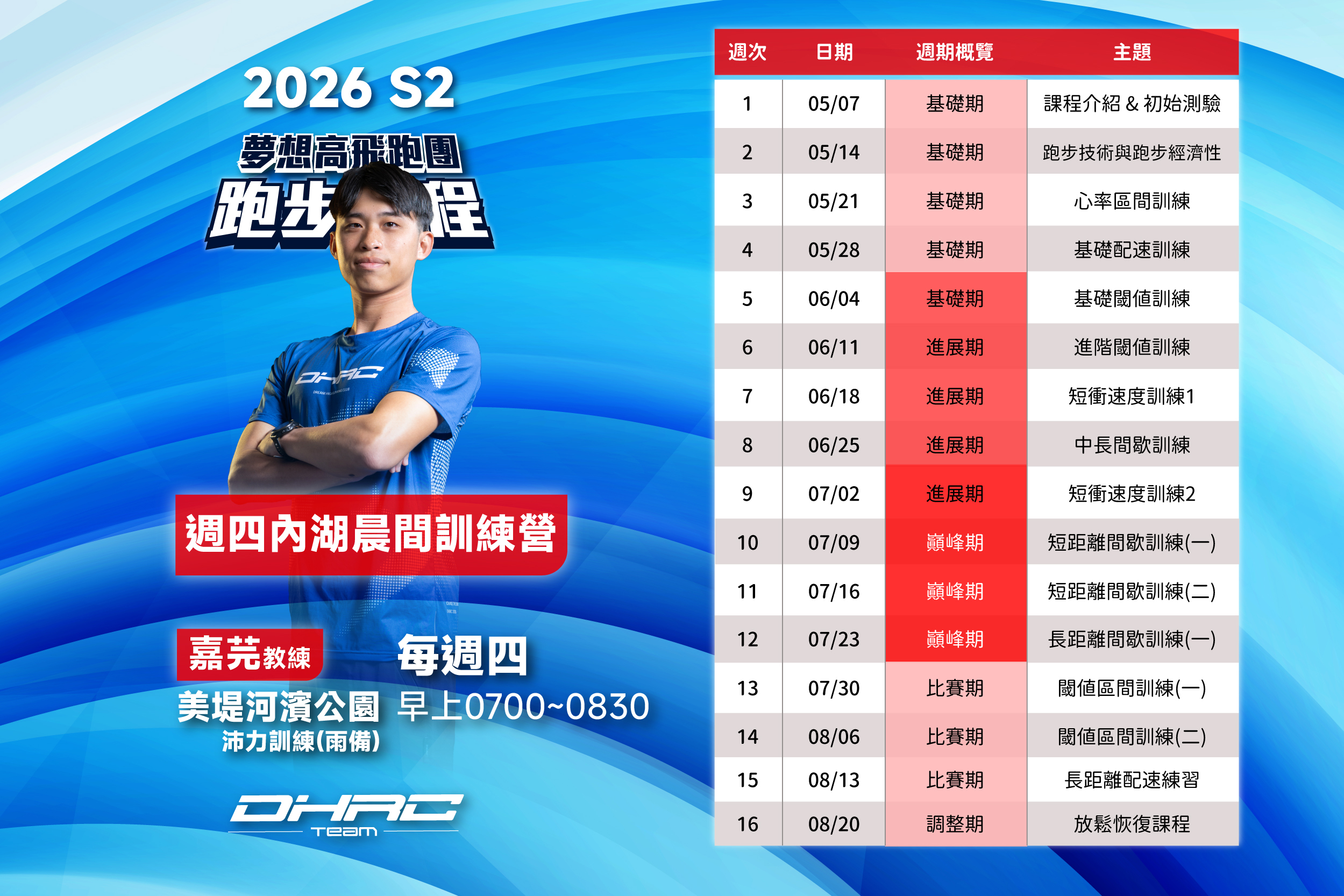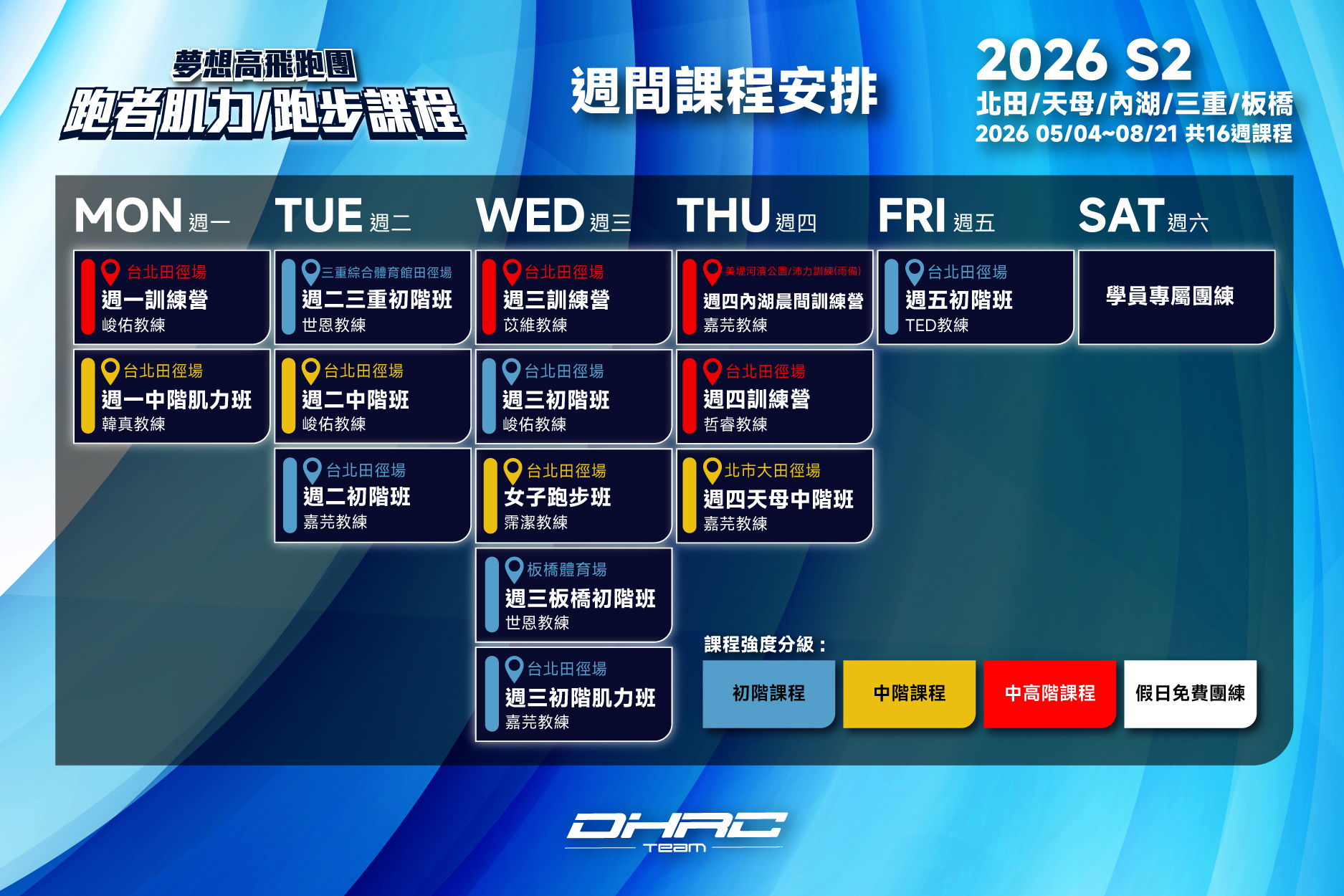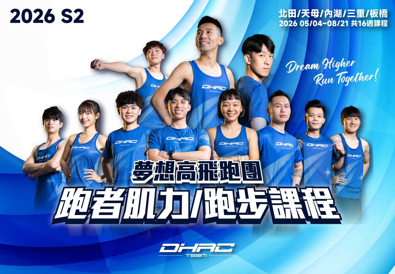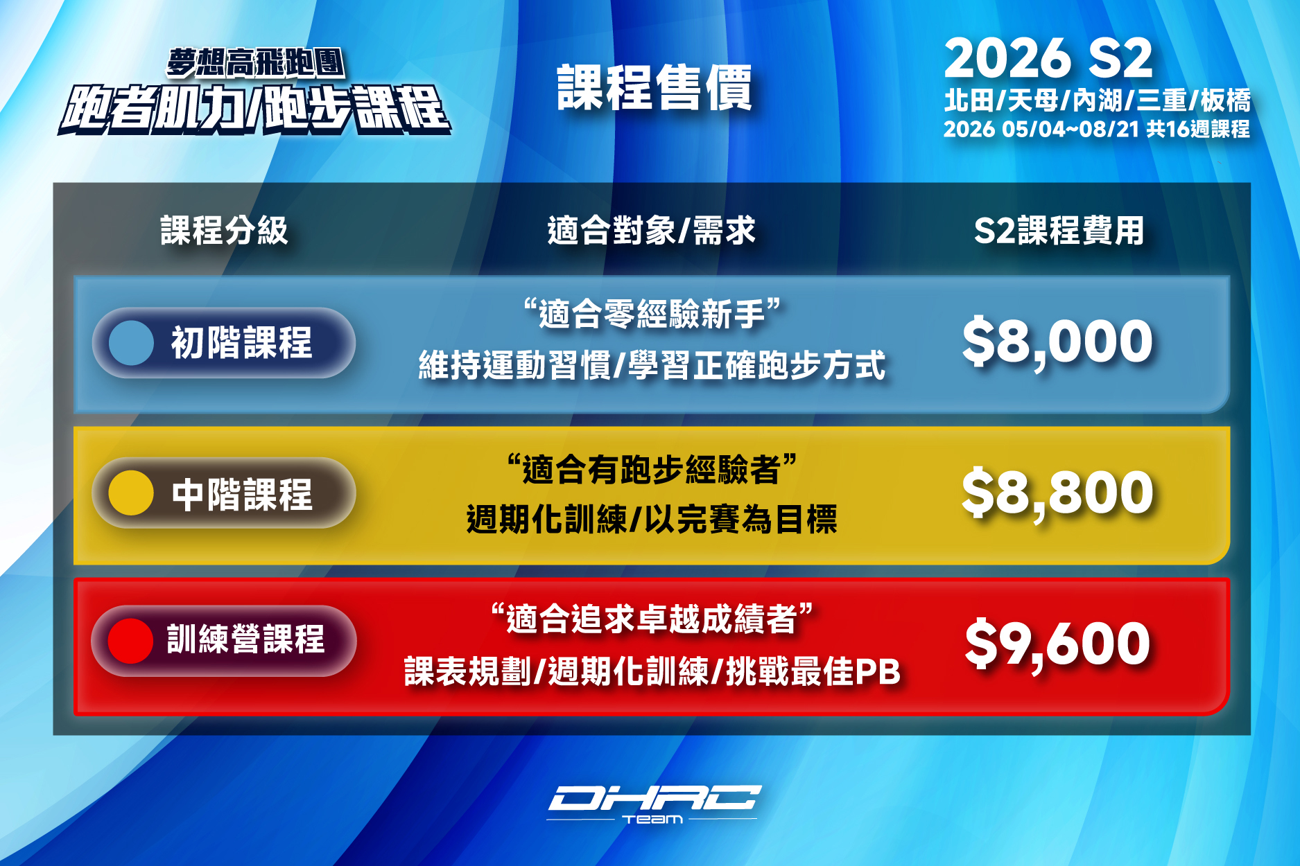 「DHRC夢想高飛跑步課程」 ✩教練群皆為專業運動員出身,我們深知每位跑者都需要不同的課程,因此無論是還沒開始跑步,想要快樂運動、培養每周跑步習慣、順利完成路跑賽事,或是目標是初馬、想要突破自己的菁英跑者都能找到不同的課程✩