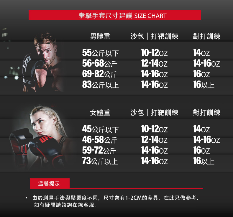1. 無論是選擇拳擊手套還是格鬥手套,最重要的都是要符合手型,拳擊手套要依據體重來選擇,體重越重oz要越重,記得要留一部分的空間給手綁帶。