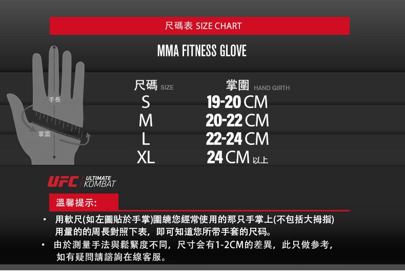 1. 無論是選擇拳擊手套還是格鬥手套,最重要的都是要符合手型,因此建議先測量手掌圍(手掌最寬處不包含姆指繞一圈的圍度)和手掌長度(最長指至手腕),記得要留一部分的空間給手綁帶。