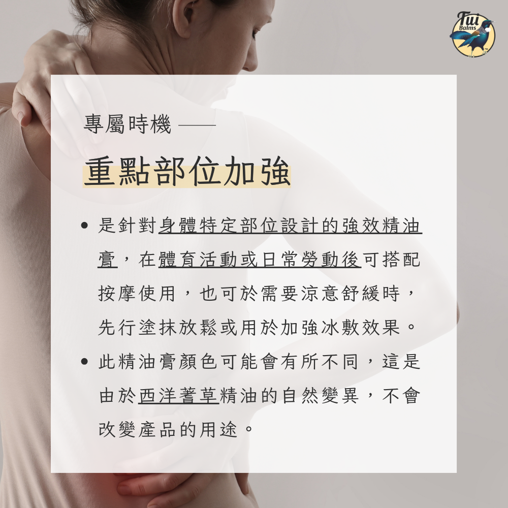⚠️使用方式:從瓶身取出少量精油膏,先在手上搓揉,待精油膏狀透過掌心溫度溶成精油狀後,按摩於需要加強的身體部位。
