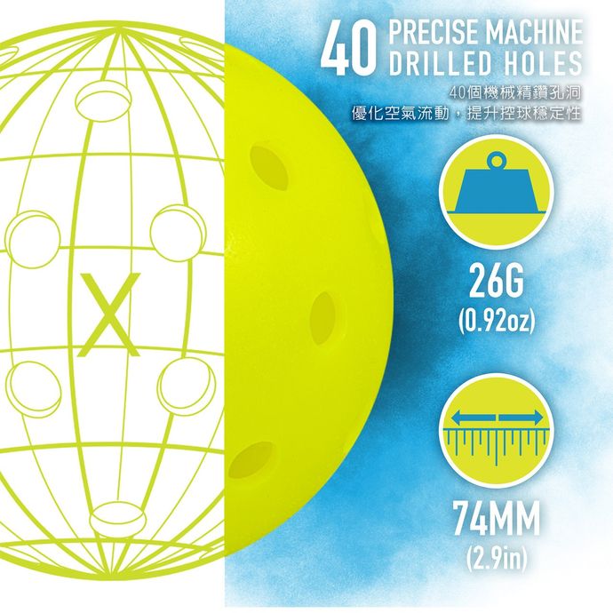 擁有完美重量與尺寸的「X-40室外匹克球」,定能吸引球場上所有人的目光!